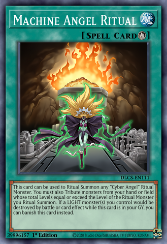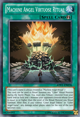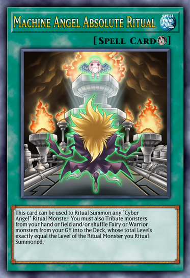 EFFECT:This card can be used to Ritual Summon any "Cyber Angel" Ritual Monster. You must also Tribute monsters from your hand or field, and/or shuffle Fairy and/or Warrior-Type monsters from your Graveyard into the Deck, whose total Levels exactly equal the Level of the Ritual Monster you Ritual Summon.