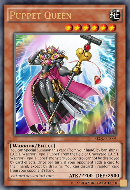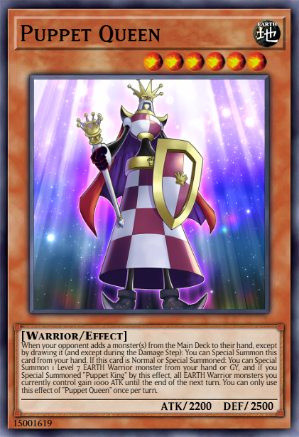 yugipedia.com/wiki/Puppet_Quee…When your opponent adds a monster(s) from the Deck to their hand, except by drawing them: You can Special Summon this card from your hand. If this card is Normal or Special Summoned: You can Special Summon 1 Level 7 EARTH Warrior monster from your hand or GY, and if it is "Puppet King", all EARTH Warrior monsters you currently control gain 1000 ATK until the end of the next turn. You can only use this effect of "Puppet Queen" once per turn.