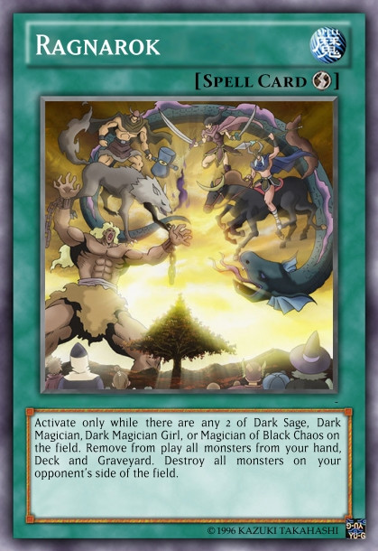 - In Norse mythology, Ragnarök is a series of future events that eliminates the world's occupants, before renewing it and repopulating it. Befitting this, this spell card is able to affect a God Card, which is normally impervious to magic, but as Ragnarök is the "twilight of the gods", the spell destroyed no one less but "The Winged Dragon of Ra ".