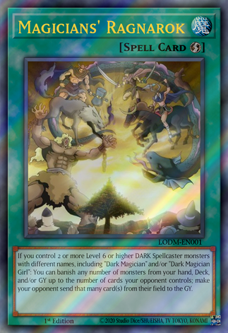 Activate only if there are any 2 of ''Dark Sage'', ''Dark Magician'', ''Dark Magician Girl'', or ''Magician of Black Chaos'' on the field; Banish all monsters from your hand, Deck and Graveyard, and if you do, you can destroy all monsters your opponent's controls. ____________________