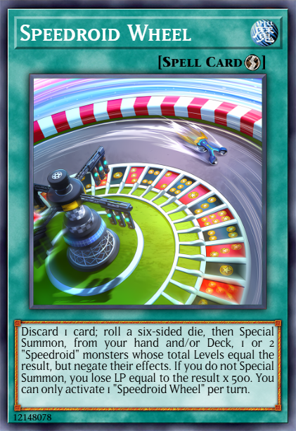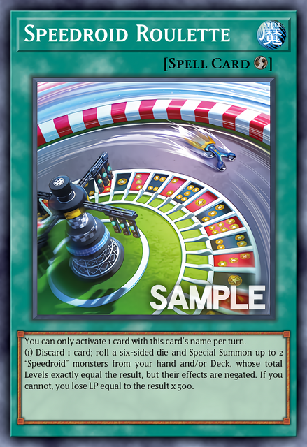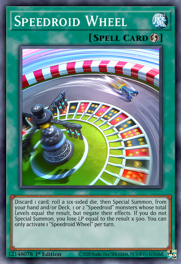 yugipedia.com/wiki/Speedroid_R…Discard 1 card; roll a six-sided die and Special Summon up to 2 "Speedroid" monsters from your hand and/or Deck whose total Levels equal the result, but negate their effects. If you did not Special Summon, you lose LP equal to the result x 500. You can only activate 1 "Speedroid Roulette" per turn.