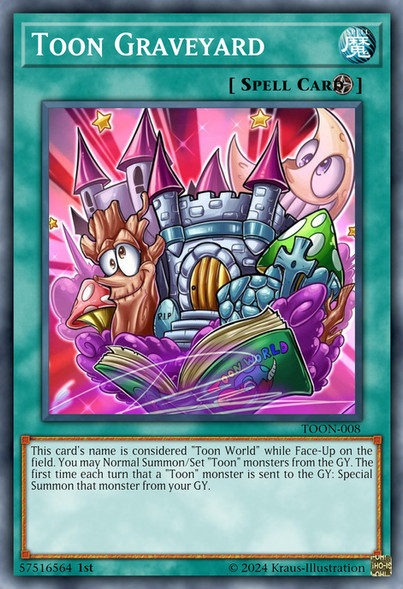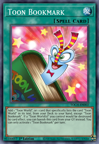 Add 1 "Toon World", or 1 card that specifically lists "Toon World" in its text, from your Deck to your hand, except "Toon Bookmark". If a "Toon World(s)" you control would be destroyed by a card effect, you can banish this card from your GY instead. You can only activate 1 "Toon Bookmark" per turn.