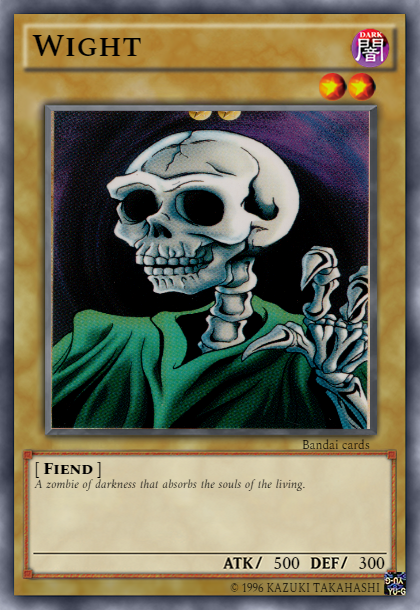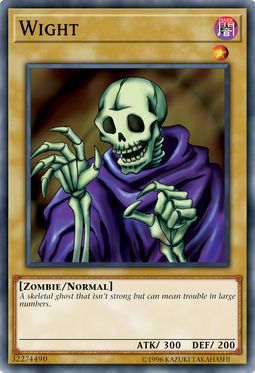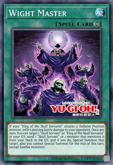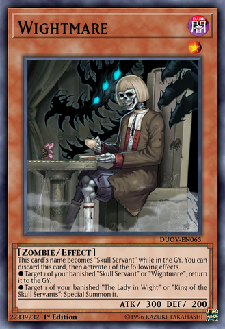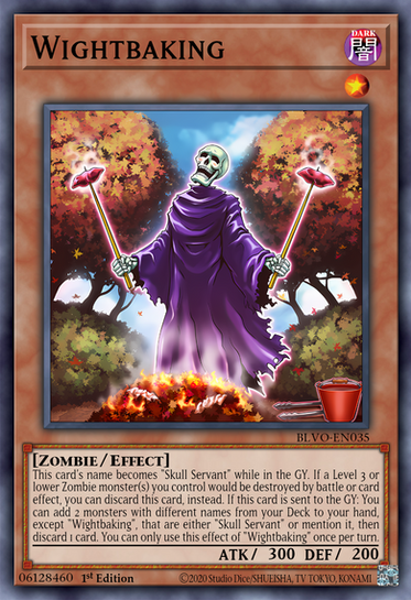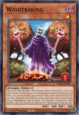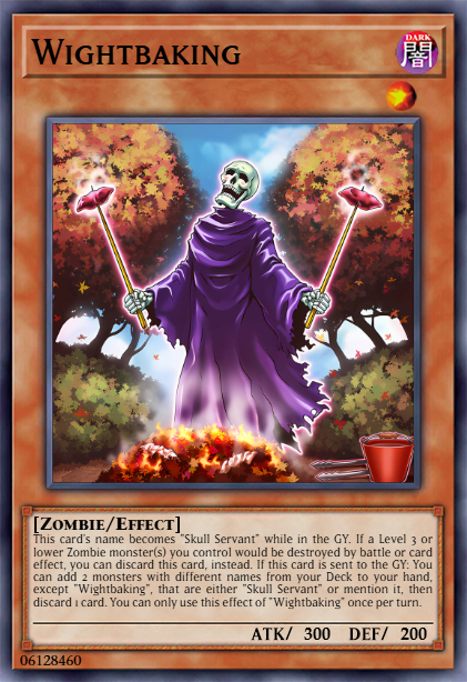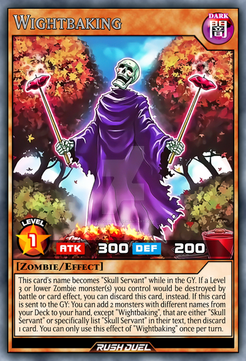 yugipedia.com/wiki/Wight_Bakinβ¦This card's name becomes "Skull Servant" while in the GY. If a Level 3 or lower Zombie monster(s) you control would be destroyed by battle or card effect, you can discard this card instead. If this card is sent to the GY: You can add 2 monsters with different names from your Deck to your hand, that are "Skull Servant" and/or specifically list the card "Skull Servant" in their text, except "Wight Baking", then discard 1 card. You can only use this effect of "Wight Baking" once per turn.