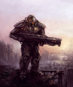 Now, onto the good stuff - the colours are excellent. The detailing is excellent; the quality of the painting overall is great. The smoke/dirt plume effects are amazing, as are the cinder effects. You did an excellent job of depicting banged-up metal on the shoulder and knee pads, and overall the lighting highlights are extremely convincing. The only thing I would change in this field is to sharpen the "white light" on the helmet, so that it looks more like a smooth, glass visor. This is, of course, if that was your intent; a greased or oily visor would have similar shine as shown by this highlight. Also, the perspective on the pistol is really good.