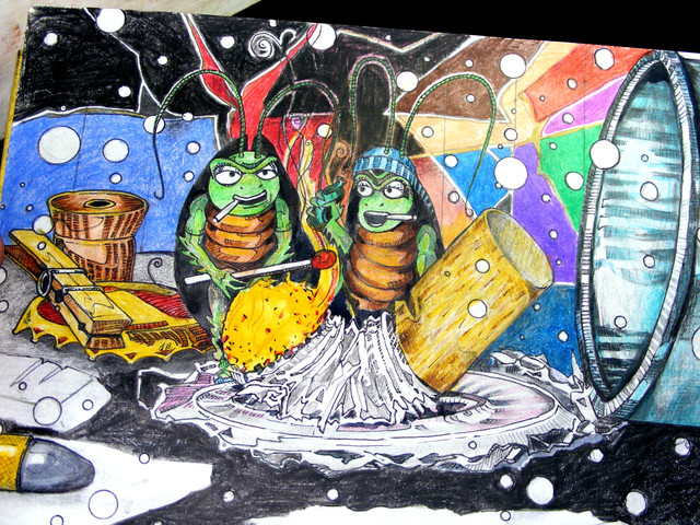 Awakened Frogs live in a primitive world; as such, they know all too well of the importance of keeping a warm fire burning -- especially in the winter months! The nipping frost is none too kind to our amphibious friends.This little fella here has been using an old tin soup can as a convenient burn pit over the last week. Just today, he found a large, crumpled ball of aluminum foil while rifling through a garbage heap. After reclaiming a sizable swath of foil from the ball, he was able to fashion a nifty thermo-reflection wall to go with his fire-can.
