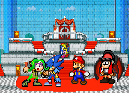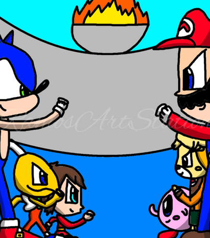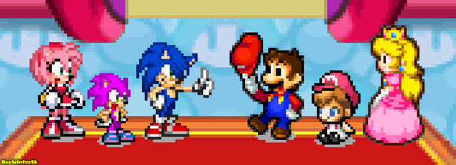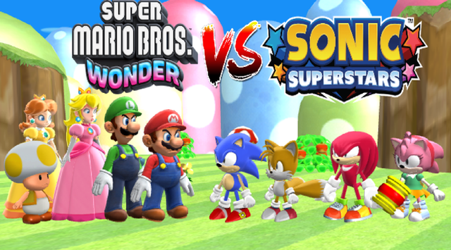 This is a pic I wanted to make after watching Nintendo's most recent direct. Especially the last announcement with Super Mario Bros. Wonder. Oddly enough, it's gonna be released almost the same time as Sonic Superstars. Both games a 2D games with 3D graphics that feel like an evolution of the 2D formula of their respective games.We have Sonic, Tails, Knuckles and Amy facing off Mario, Luigi, Toad and Princess Peach.