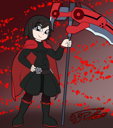 I FINALLY drew a RWBY character, starting with Ruby Rose, the main protagonist and my favorite character of the show. That's because she's an absolute sweetheart with an optimistic heart. She's a badass and she loves dogs! She's my Sweet Chocolate Chip Cookie! By the way, I drew her in her Volume 1 outfit, because I thought that's the easy one to draw. Seriously, I'm digging into the 'Perky Goth' trope, which it's a character who, despite being dressed in gothic attire, is a cheerful cinnamon roll.And, yes, I'm planning to draw the rest of the RWBY team, so stay tuned RWBY-lievers!