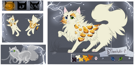 Personality: BrokenMyth is a gentle and sweet cat, that loves making jokes while she's horrible at it (dry humor much xD). Although she loves making jokes, she doesn't always say them. She respects her Leader and Deputy a lot and will try to do anything to please them. She's a loyal Clan cat and will give up her life if it meant to protect her Clan. However, she can get quite distant and easily upset sometimes, and at the worst, she snap. When this happens, only someone really close to her can bring her back. It's not always sure what she does when she snaps - she either goes in the attack, or cry and won't stop crying and being depressed, unless a close one brings her mind 'back' to reality. Most of the time she doesn't even remember she snapped at all or what was the reason to. She can be mysterious at times, but at other times her mind is easy to read. She's not the best and smartest at fighting, but she can be fierce in it if needed. She's also a fine hunter. She can be shy at first, but once you get to know her and accept her she can be quite outgoing (also, if you want to be friends with her, she's most likely not the one to go to you, as she's too shy! XD) She can be quite jumpy and a dreamer sometimes.