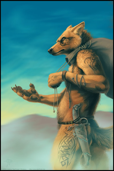Good pose and expression. Painting was done cery well. But, the right bicep is too big, compared to the left. I'm also having difficulty figuring out what the specks around the fox are; that's my only comment.