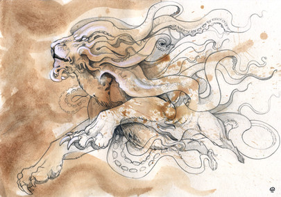Another picture about the species Parvus Scolopendra. There is something, which I call "addiction" because I really enjoy drawing them and their abnormality. Sensitivity II shows the back of the creature in a quite femals position.Not only the head is transparent and covered with a membrane like jelly-fish skin. The back is one of the most important characteristic of the Parvus Scolopendras.
