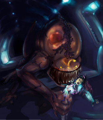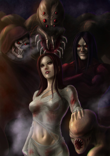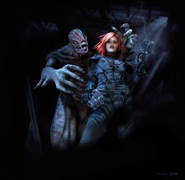 The atmosphere in this is really great! The sharp lighting on the girl and the perspective of the monster just around the corner really gives it that dramatic, horror look. Great job!