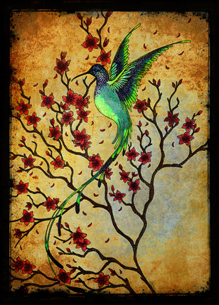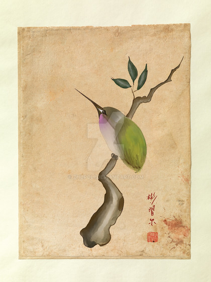 This is very beautiful! I really enjoy the shiny green of the hummingbird against the soft pink background.