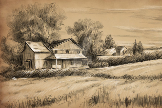 #countryside #detailed #drawing #farmhouse #hills #nature #peaceful #pencil #rolling #rustic #serene #tranquil