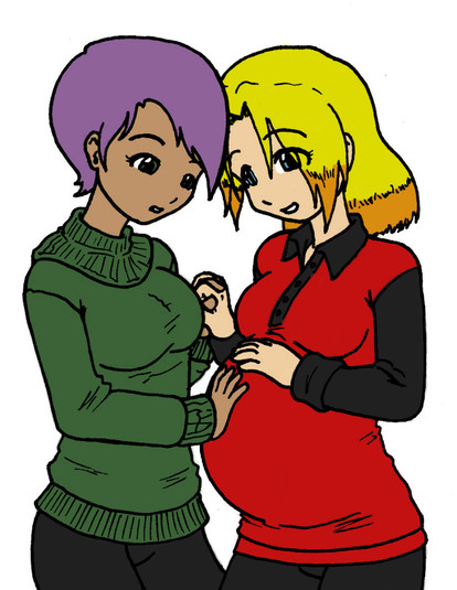 I was the first one, having come up with a twist of Agni falling in love with Kim of all people (something she kept denying to herself for a while) and eventually hooked up with her. In this unfinished story (which is what this pic is based on), neither of the tweebs is responsable in any way for Agni's pregnancy. The other parent of the live(s) growing within Agni is meant to be Kim. This is, after all, an alternative continuity.