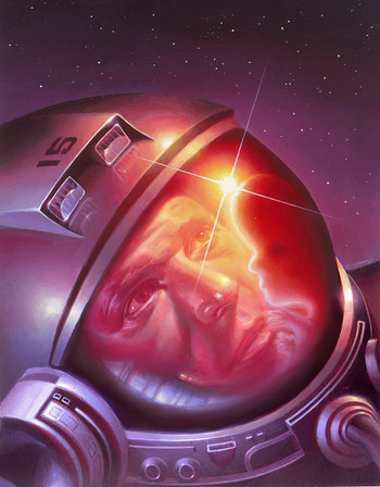 This painting depicts an astronaut being shown the destruction of his planet, Earth, after touching a monolith on a distant planet.