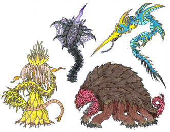 Bottom left is an almost avian species that also inhabits a colder world, though one with slightly less gravity than earth. Though their limb arrangement is their most evident characteristic, their most unique biological feature is their head. What appears to be a beak is actually a hardened cover that protects a singular large eye with their actual mouth being located on their chest in the form of an extendable proboscis.