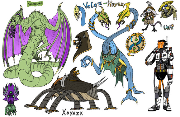 Having a tendency to jump from project to project, I decided to try to finish things I've started and work back down to my picture book that I've put off long enough. This set here is from my alien brainstorm doodles. I've made several iterations of them then picked the four I liked the best and colored them. I'll try to summarize each of them.Top left is a Xenopteran (the only one I've named from this set). They are a highly advanced yet aggressive ant-like species whose technology is indistinguishable from their own biology. Like some ant species, they are polymorphic with members having varying sizes and shapes based on their caste. As a species, the Xenoterans have a strong drive to expand and converting other planets into their "hive worlds" sparing only the species that prove useful to them.