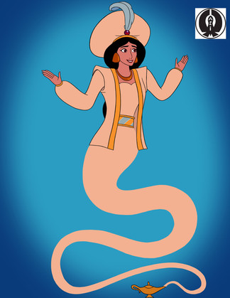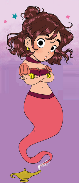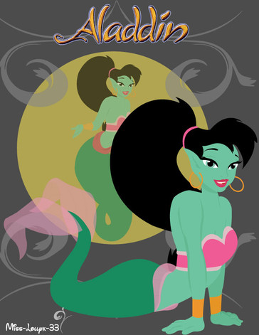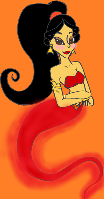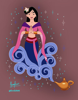 Calculating the results of both my Tumblr and Deviantart polls, the winner of which princess I should draw as a genie was Mulan. In a way it's kinda fitting as the original story of Aladdin was actually set in China. I felt that a piece like this deserved more details like different colored line art and extra shading/highlights. I hope you all like the end result. A side note, Mulan's headdress is inspired by something she wore near the end of the strait to video movie Mulan 2.Mulan belongs to Disney.