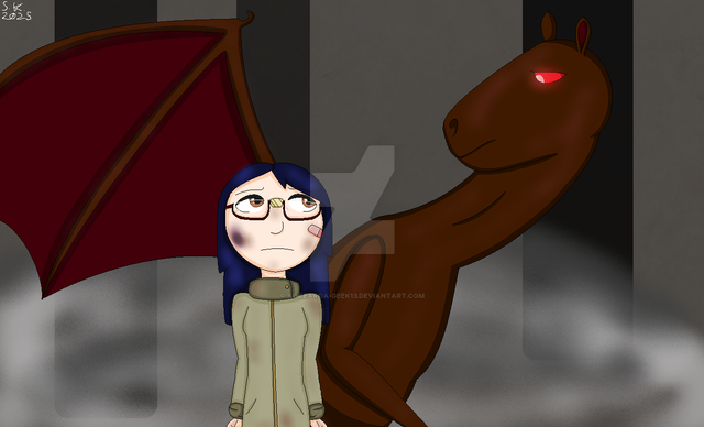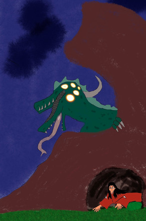 This is my second piece for the Halloween Season and I'm pulling a character and creature from a story concept I haven't visited in a while. For a reminder, that concept is titled "Galune" and is inspired by the works of Don Bluth (The Secret of NIHM, The Land Before Time, Titan A.E., etc). It follows a quirky medieval young woman named Agatha whose life is turned upside down when a strange artifact that fell from the sky attached to her arm. The scene here Agatha trying not to make a sound while hiding for her life from Galune's main antagonists, the dragons. The dragon in particular was particularly fun to do and reminded me of how Bluth was able to make some pretty terrifying creatures in hand drawn animation.As always, comments and critiques are welcome.