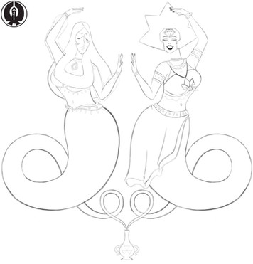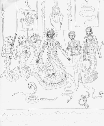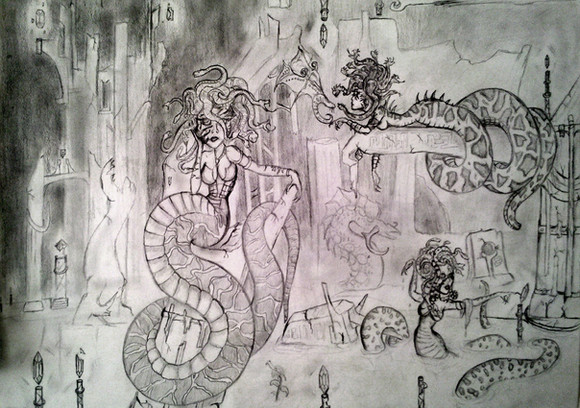 note: In the original mythology she is said to have 6 long necks with gristly heads and wolf heads around her waist. I didn't now how to incorporate the heads well and most iconography of her shows her with a normal upper torso. As for the wolf heads, I used moray eels instead as they are actually sea life and there heads kinda resemble wolves in a way.