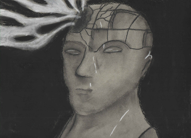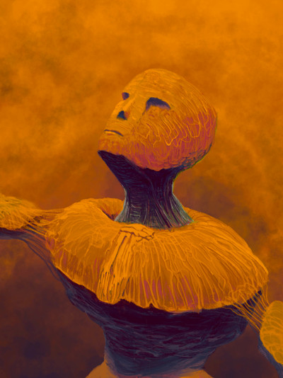 The face has a sort of stylized pattern feel, bringing to mind mosaics, while the shadowed rest of her body is more three-dimensional.