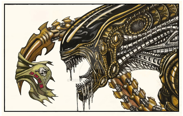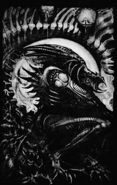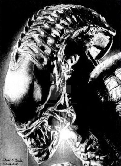 Detail: The fine details here are excellent. The design of the Alien is a perfect combination of the designs from the first and second movies, the artist has clearly researched and used reference. The torso (thorax) retains that exoskeletal/armored quality, but also the shiny, otherworldly feel of a material that we have never seen. Is it bone? Metal? Rubber? To capture that quality is something I have seen very few artists do. The reflections on the ribs, arms, head and tail are all perfectly in harmony. There is no indication of multiple or alternative lightsources, which lends this not only a homogenous look, but also makes it look very professional.