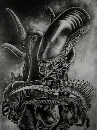 You should draw...A Tyrannosaurus vs a Alien queen..and yes it works be use Dinosaur scails are two tough to be dissolved by there blood