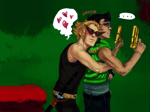 I know I'm not in the fandom but this is AMAZING. Dirks expression is so perfect. Like... he can't help that he likes the violence and Kaliborn ... I just love how you draw him! The shading, bruising, blood... UGH. It's so upsetting that more people don't comment because they don't like the pair This is GORGEOUS and I wish I had the depth and control you have with coloring and shading. Not to mention how detailed their gorgeous faces are. The shading in Dirks hair, Kaliborns beautiful, full lashes. This is amazing *U*