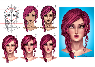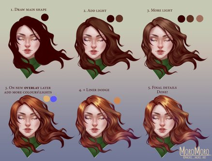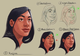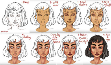 Lights + Depth - Keep your light source in mind for this! Take the skin colour and use a screen layer, painting in highlights such as the tip of the nose, chin, forehead and collarbones. I tend to add hard light in the inner corner of the eyes to make them stand out more. If you want more depth in the face, paint a long strip of lighter colour stretching from the top lip to the under lid of the eyes and blend it out.