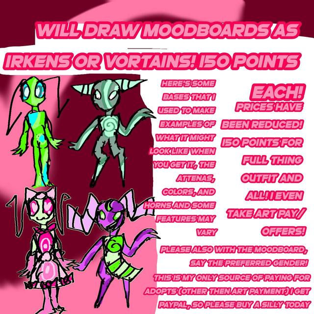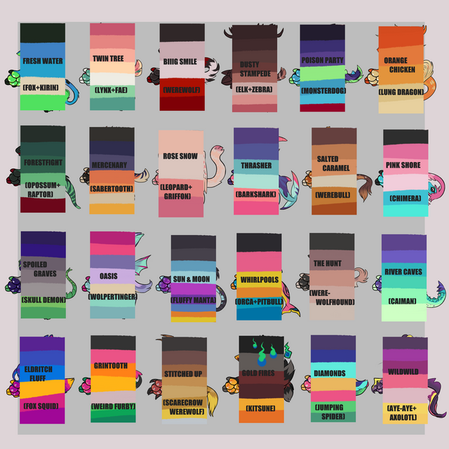 So, here's the deal: I will design a simple monster based on the palette given! Along with picking the palette, you need to give me three adjectives you'd like your monster to have so that I have something to go off of (for example, "I'd like palette 1 to be simple, elegant, and graceful").Your monster will be flat color and a relatively simple design. If, however, you'd like your monster to have more detail and detailed shading, it will cost you extra. You can note me what you had in mind, and after evaluation, I'll give you my price.