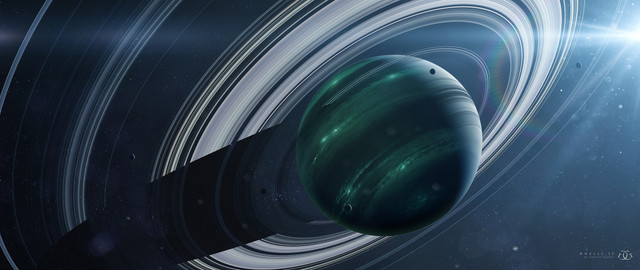 -Ares is a moon roughly twice the size as ours and is the closest moon to the planet (moon to the lower left). it is a cold world with many fractures that formed early in its history. it is in a 5:3 resonance with the outer moon ovius, completing 5 orbits for every 3 ovius makes. it is also responsible for the sparse area near the outer edge of the ring system, as the material in this area experience orbital decay from unstable resonances with the moon. it orbits gailis every 15 days.