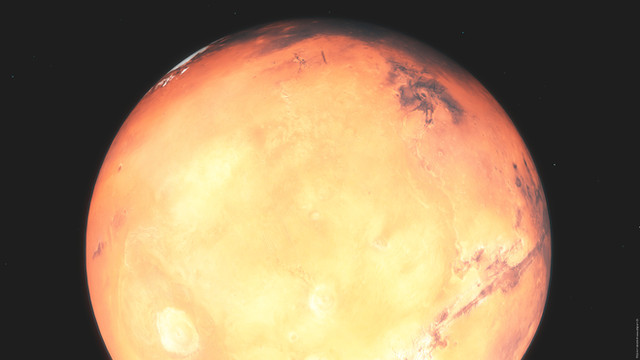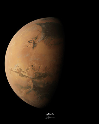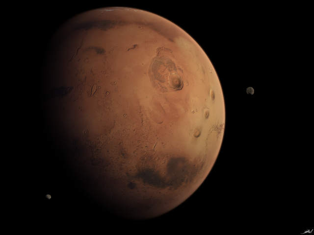 This is an awfully realistic looking illustration. I usually envision Mars as having oceans and seas of water on its surface, and sometimes even with conditions similar to Earth. The two moons, Phobos and Deimos, don't actually look like moons, but they actually look a little bit like asteroids that were kidnapped by Mars and are now being held captive as prisoners in its orbit. I do believe, however, that there is life on Mars, just like there is life on Earth. Other than that, I like this image. I dream of visiting Mars someday to visit those peaceful aliens.
