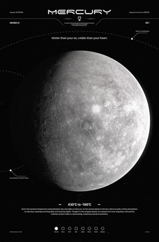 mercury is the closest planet to the sun the smallest and also the fastest planet in the entire solar system. because of this, it was named after the messanger of the gods and its alternative name is hermes. it is a heavily cratered world similar to our moon and has the largest core relative to the size of the planet. it also has the most eccentric orbit of all the planets and the most inclined to the plane of the ecliptic (the plane upon which the earth orbits). it also experiences tidal perturbations from the other planets and the sun that cause its rotation period and orbit to resonate causing one day on the planet to last two years on the planet. because its axial tlt is almost zero, ercury has no seasons, and thus water ice can exist in the always shadowed regions of craters at the polar regions. mercury has a very weak magnetosphere and an extremely thin atmosphere (where most scientists say that it is more of an exosphere) that is constantly replenished by the solar wind. over the coarse of billions of years as the solar system ages, continuous interactions of mercury with the other planets will cause its orbit to become ever more eccentric until scientists say that it will probably impact venus. but thats billions of years from now and the probability of it impacting venus is only 1%.