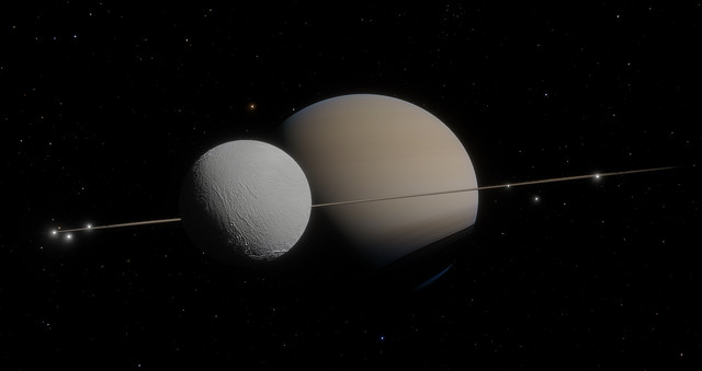 from left to right around saturn: enceladus, mimas, dione, tethys, iapetus (off in the distance tp the right behind saturn), rhea (largest moon other than titan). so please enjoy the image and feedback is welcomed!