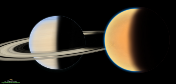 titan is noticebly saturn's largest moon, comprising 90% of the mass in orbit around the planet including the rings. it is the second largest moon in the solar system after jupiter's moon ganymede and it is even bigger than the planet mercury. it orbits on the same plane of the planet's rings just like most of the other major moons, and so the rings would appear edge on from titan. titan is the sixth major moon in order from saturn. it is tidally locked to saturn and so always presents the same face to the planet. titan is also the only moon in the solar system with a large dense atmosphere, and it is this atmosphere that gives the moon its orange puffy appearance, and hides its surface, similar to that of the planet venus. titan's atmosphere has a very similar composition to that of early earth's. titan has large lakes, seas and rivers of liquid hydrocarbons and is the only body other than earth to have liquids on its surface.