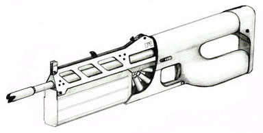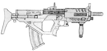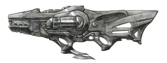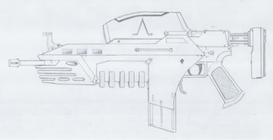 This is the first prototype design for the UTA SSR. The rifle itself is built by strong yet light material, allowing it to preserve not only as a gun, but partly armor. The rifle is constructed to normally be carried by a small or medium armored UTA trooper. It is designed spesifically for planetarial missions, but is fully operational in space. The rifle was approved by the UTA in 2630, and has been used for 5 years with slight modifications. The image above showing the frst prototype might be misleading, the design has been altered aerodynamic.