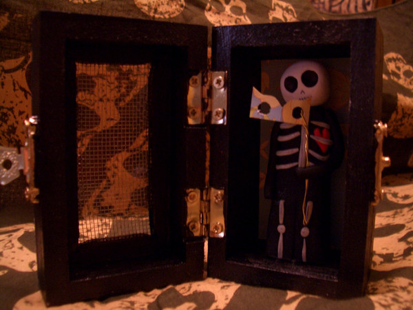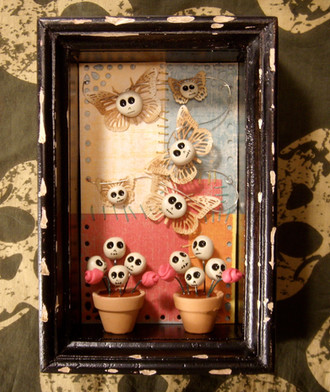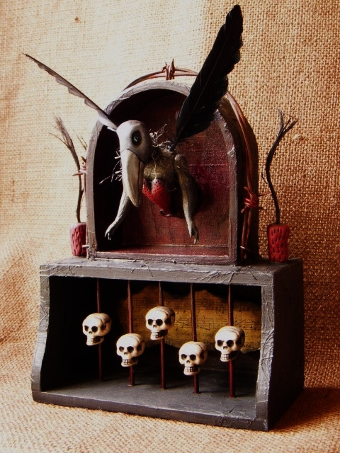 wooden box, polymer clay, wooden dowel, paint, mossRelated content