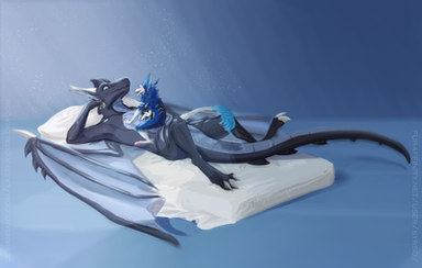 #anthro #athletic #azure #bed #blue #couple #dragon #dragoness #embrace #female #furry #hug #love #mane #pink #romantic #scale #shark #space #spaceship #stars #wing #wings #avali