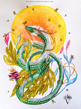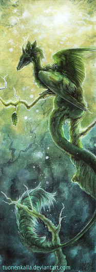 I love the greens and orange that melt into lighter colours. Also the dragons are pretty cute! ^.^ And the overall branch structure which makes a dragon I think is very creative! :-D