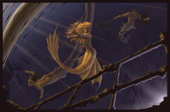 Haven't posted new art for a while because work keeps me real busy. Right now I'm one of the concept artists at the studio, designing creatures and monsters for an upcoming project. Things have been going great for me so far. Thanks for all the support!I figured mermaids must get bored of eating fish all the time. So I painted this illustration depicting one method mermaids could use for hunting animals that live above the sea.