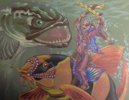 Very impressed, both with your concept and with you've done with it. There is so much here. The speared white bird in the foreground is a powerful symbol in itself, no matter whether you feel sorry for it, or impressed by the skill of the huntress, or both. There's a sense of fulfillment in the smile and the posture of the red-headed mermaid. And the central figures of the great fish and and its rider, rising from the ocean: the word "goddess" comes to mind.
