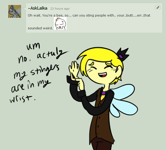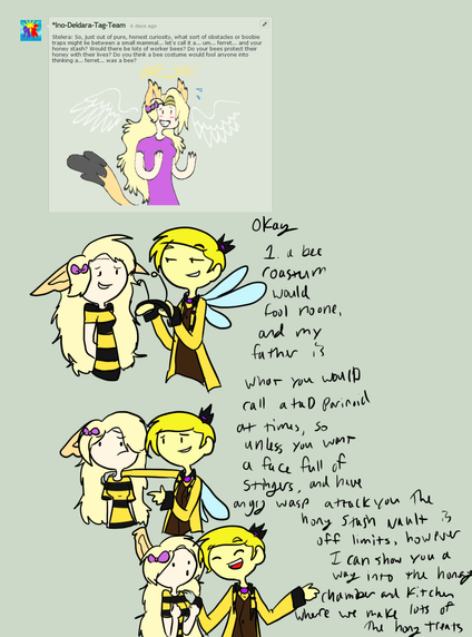 (( oh look the third place winner featured in a question. yay!! yeah no i didn't forget its just been....ugg....i have had a really bad artblock latly and im tryng to break it. i will get to the contest prizes as soon as i can and im sorry for takng so long *sobs))((Other bee belongs to ))