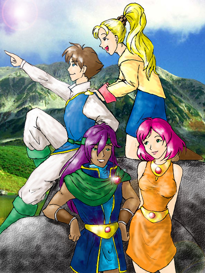 Concept illustration for a fanfic ~aislianu is writing, wherein Sora and Riku vanish and it's Kairi's turn to go out and Save the Universe. The concept tickles my fancy, so of course it gets art.Donald and Goofy are scouting the area on an unfamiliar new world, while Kairi talks strategy with NaminΓ© and Roxas. (Roxas is there for reasons relating to Sora's disappearance in the fic.)