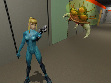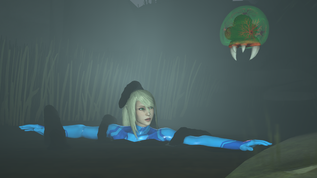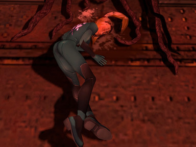 Samus moved over towards the button fearing a trap, the floor would give way, a lazer would cut her down or some other diabolical device. but what lay in wait above Samus was no device or trap...it was something far worse.Just as she was about to press the button a large creature jumped down from the pipes above, the bounty hunter jumped around in shock and the creature lunged at her.