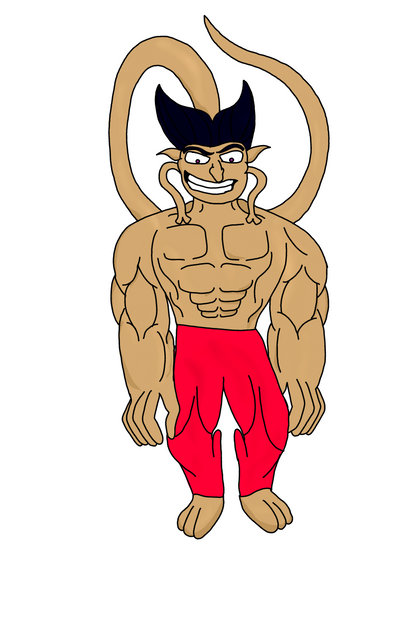 While his torso and legs didn't change, his arms gained elasticity, along with growing a second pair of arms on his back. His head became misshapen until it resembled a human hand. He also grew multiple eyes on each of his hands, but is without a mouth or any means of vocalization or eating.
