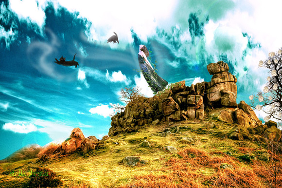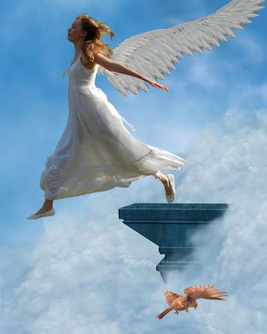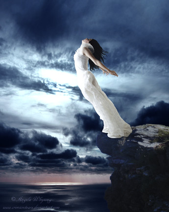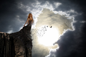 #blue #cliff #digitalart #digitalartwork #fantasy #fantasycreature #fantasygirl #feathers #flight #jump #owl #photomanipulation #skyclouds #woman