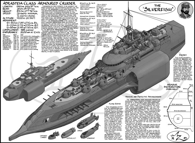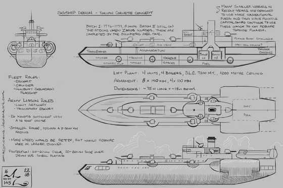 Finally, regarding gun size, that's an author's decision from ages: the Torvan forces employ no intermediate sizes between 180, 140, and 100mm, preferring to standardize fleet weaponry as much as possible and limit the profusion of calibres frequently found in other forces. Aerial torpedoes have not been invented yet (fixed-wing flight has lagged due to having great big flying things) so the 'destroyer' does not yet exist in the skies of Tethys.