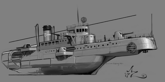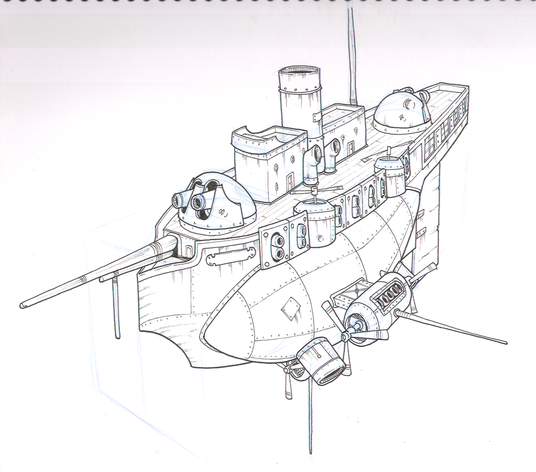 Tactical doctrine is still evolving a little; the fixed-wing aeroplane hasn't gotten off the ground yet, and rocketry is still a little touch-and-go, so the primary asymmetrical response to capital ships comes in the form of Gunboats or Gunships, which are pretty much just a large-bore gun with a bit of flying ship bolted on the back. They can be dangerous in packs and are quite cheap, but as current lift systems are very averse to inclination out of the horizontal plane, not as dangerous as they could be if they could attack from below. Small craft armed with batteries of howitzers to attack the thinner underside can be useful as well, but easily countered by just flying low and are mainly an ambush weapon.