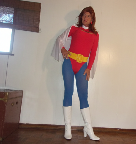 Our seamstress had worked quickly off of Nicola Rae’s measurements to make the costume, and that Friday night we had a fitting over at Bill’s house. The costume seemed to look amazing on the coat hanger… but it didn’t fit!!!! Nicola Rae couldn’t even get it on to model it for us. Also, the cape and the mask were not done! Nicola Rae had been tasked with getting her own boots. She ended up bringing high-heeled go-go boots to the fitting, but they were black! And to top it off, Nicola Rae’s actress friend flaked out and cancelled at the last minute, which meant that my script now had no villainess! The entire script revolved around Stormy Tempest vs. the Queen of the Gorla Monks! We had no functional Stormy costume and no Queen!