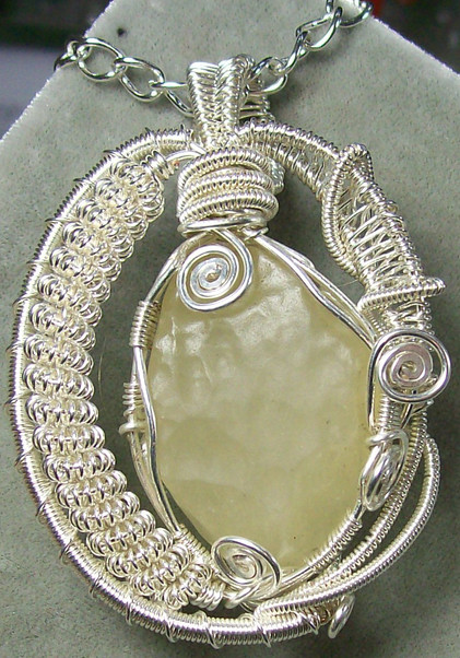 This piece was created thanks to some of my students. I usually set a few stones out in front of them when I teach a class and ask them to pick one or two for me to wrap while I teach them the wire-wrapping art. This lets them see how it's done while they make their own wrapped piece and keeps me from hovering too much!Of course this group chose the brightest, sparkliest one I had as the example - a druzy quartz cabochon that has been dyed to get that wild pink and then coated using the Azotics(TM) process. They were all pleased with what I came up with for them.